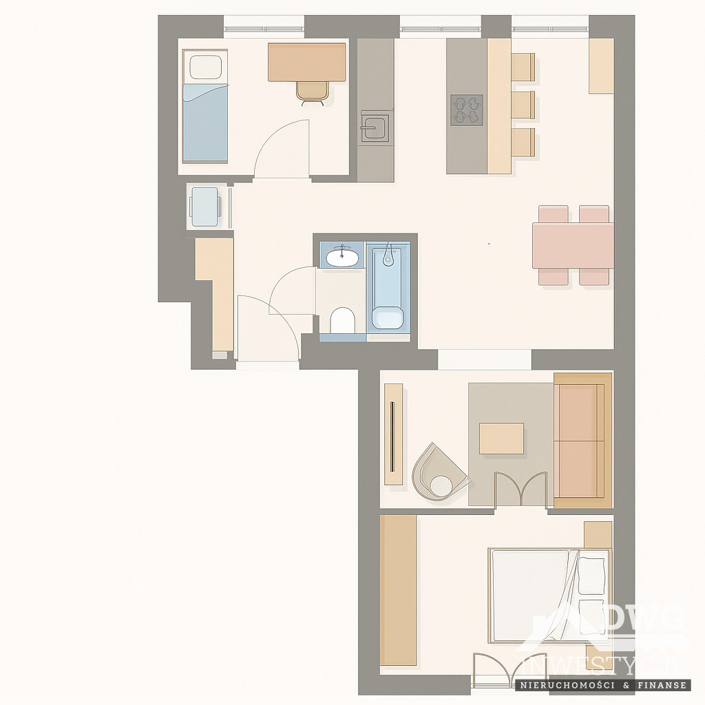 Lokal ma powierzchnię ok. 49 m² i oferuje funkcjonalny układ 3 pokoi, zapewniający komfort codziennego użytkowania oraz logiczny podział przestrzeni.