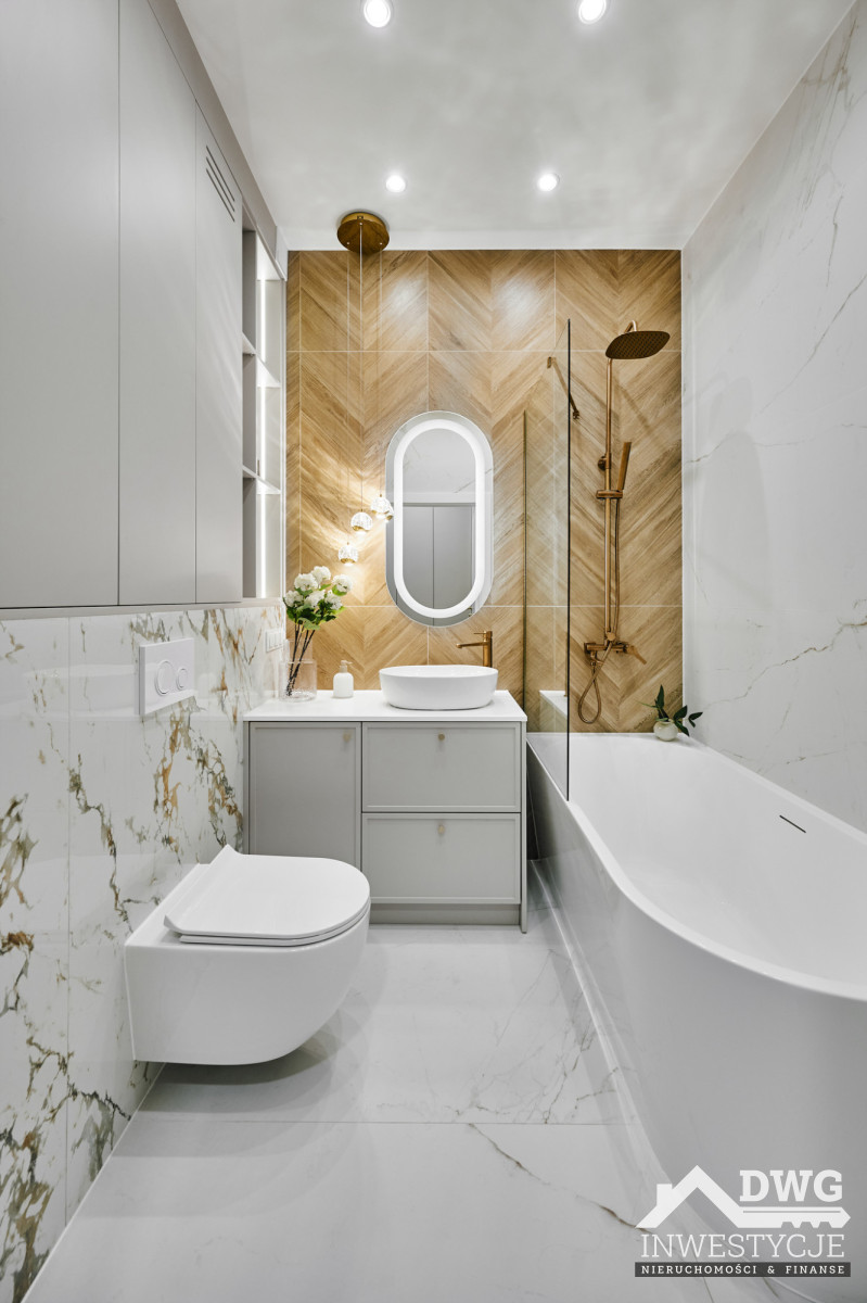 - elegancka łazienka z wanną i prysznicem,